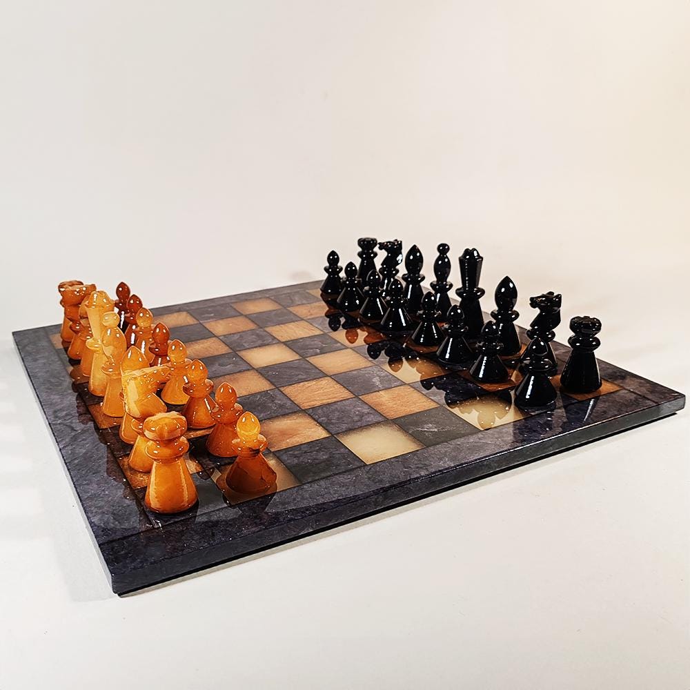 1970s Big Chess Set in Genuine Hand Carved Alabaster of Volterra - Black and Brown - Made in Italy. 40 cm
