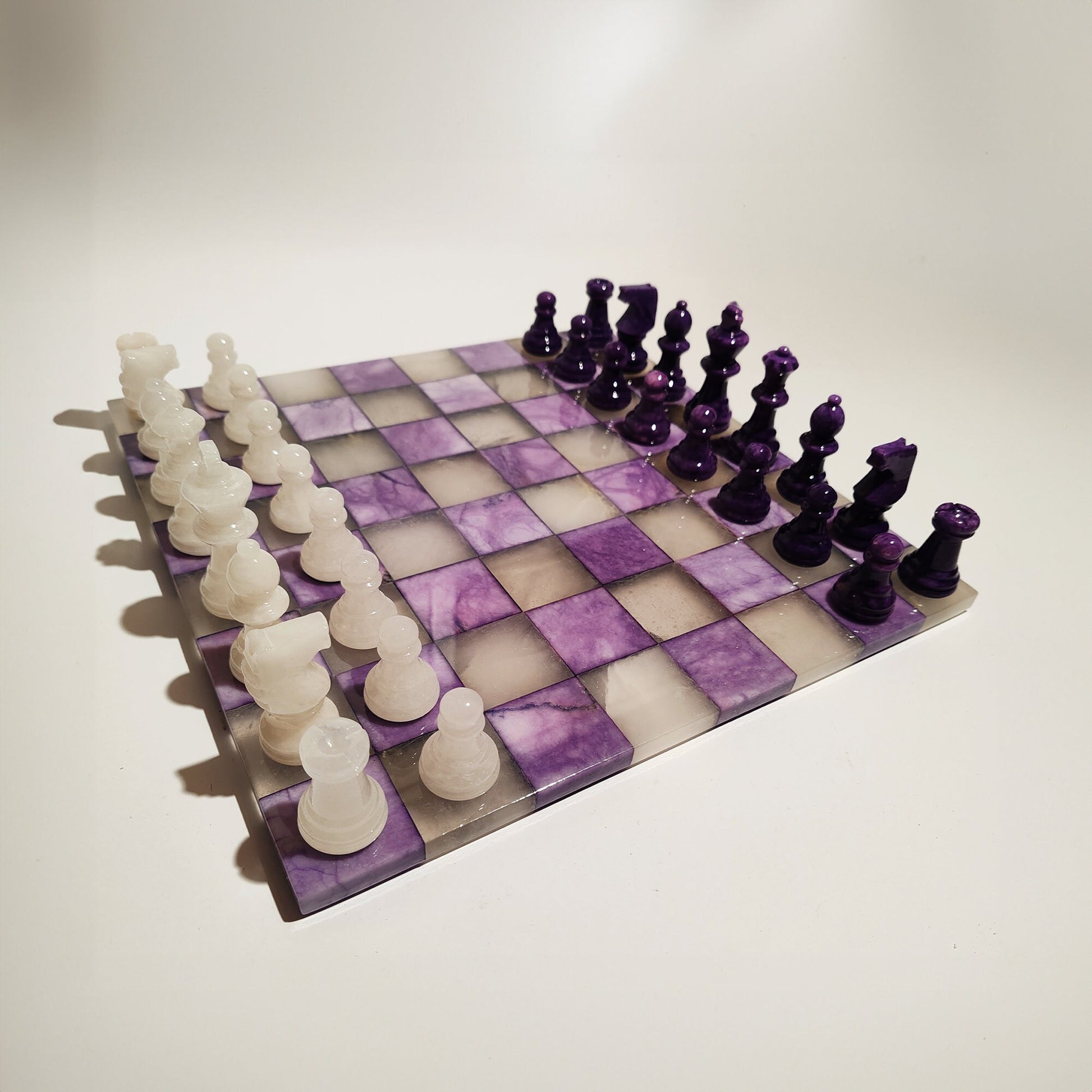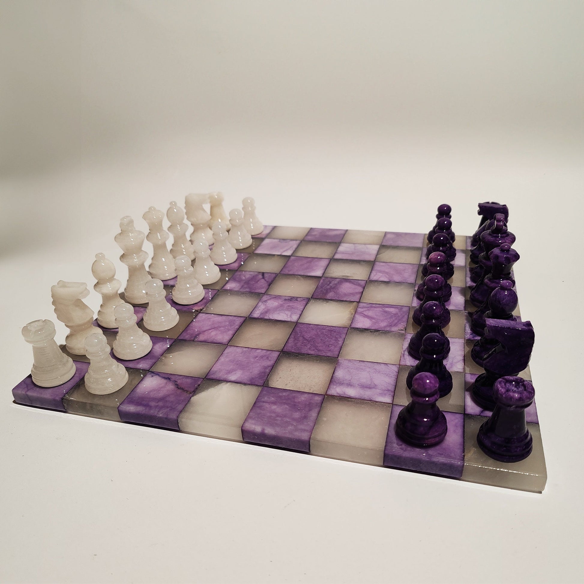 1970s Chess Set in Hand Carved Genuine Alabaster of Volterra. Transparent White and Purple - Made in Italy